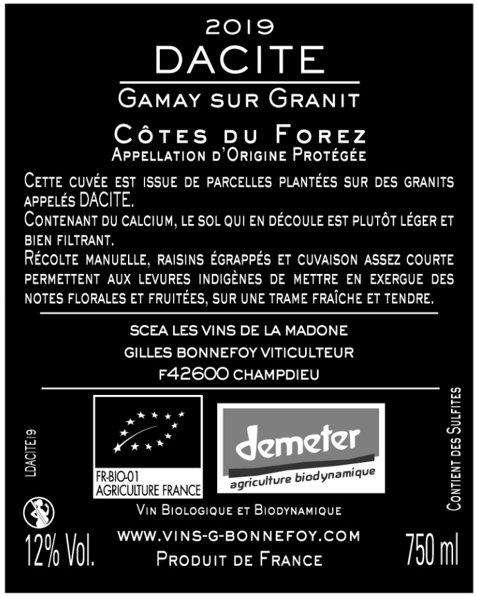 ロワール河最上流のアペラシオン、コート・デュ・フォレ。湿っぽくて平らな畑の多いロワールとしてはめずらしく、降雨量 が年間400mlと少なく、畑は最大斜度50%の急斜面で標高450mの高さにある。当主はジル・ボンヌフォワ氏。所有する畑は11.5ha。隣人がいないためオーガニック栽培には最適。このアペラシオンでは唯一ビオディナミ農法を実施する生産者。土壌はマグマで出来た火成岩で、軽くて細かいものがグラニット(花崗岩)、重くて粗いものがバザルト(玄武岩)。石灰質土壌が大半のフランスで、火成岩土壌の畑は少ない。この味わいは他のロワールワインのどこにもない個性であるといえる。